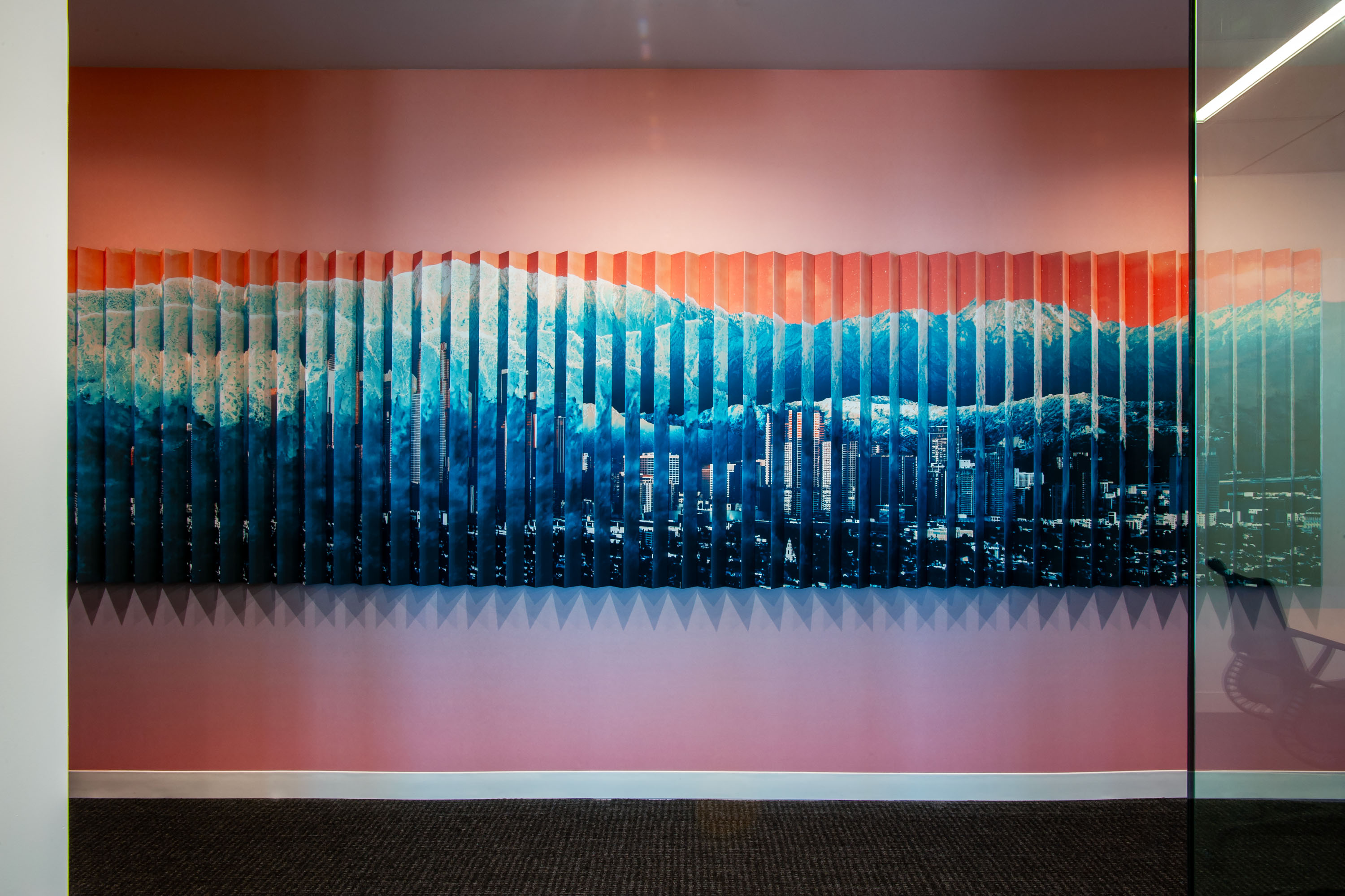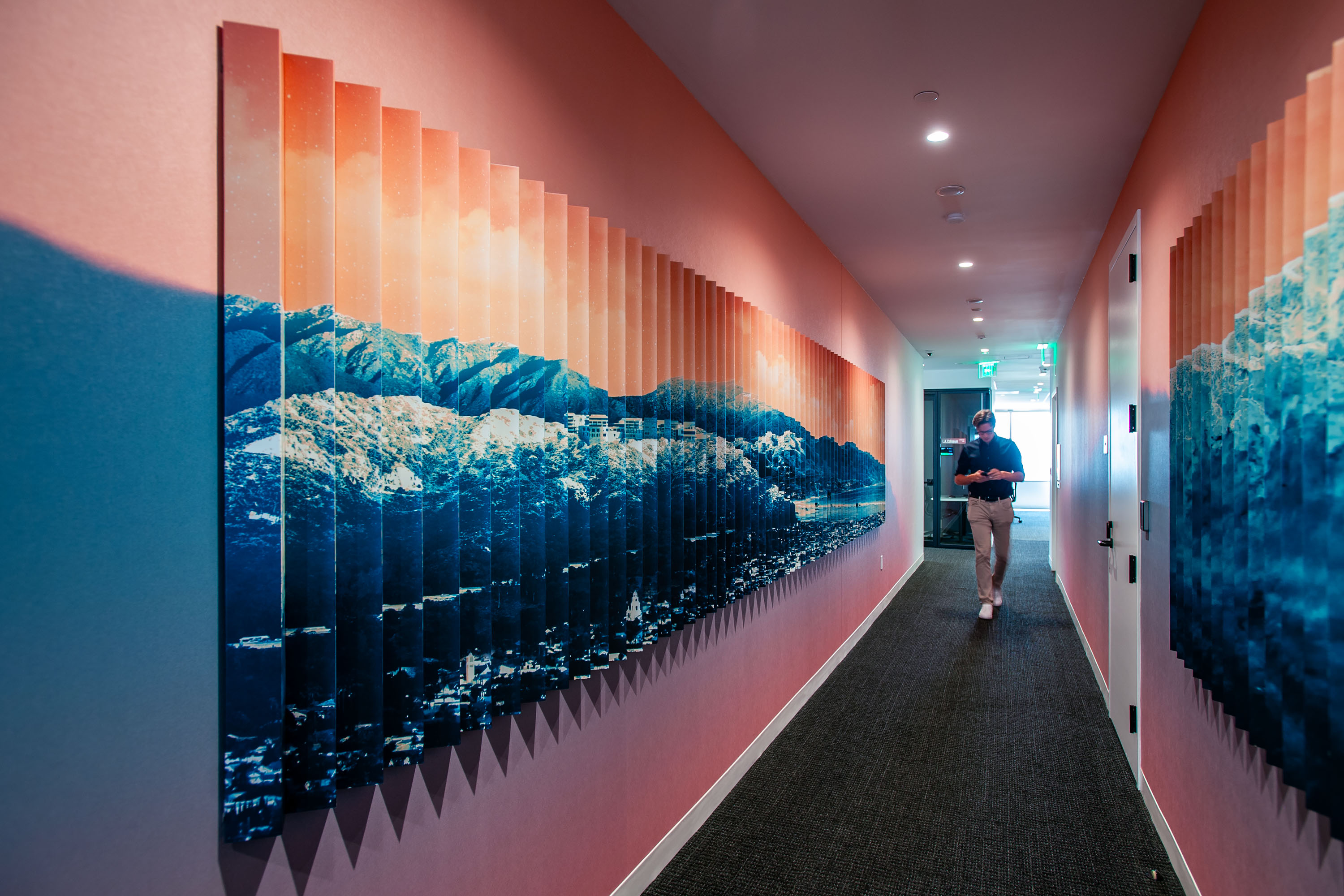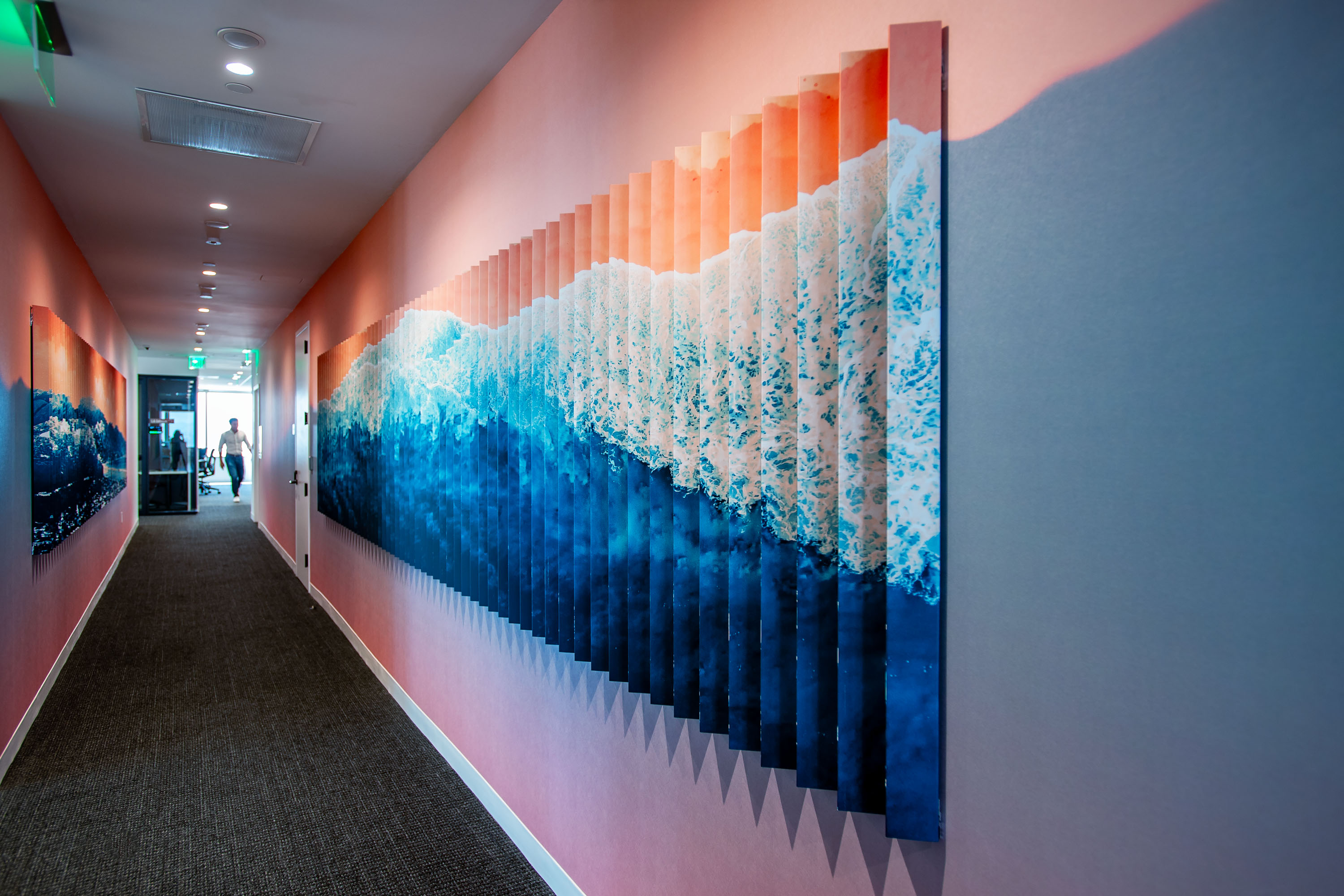 Asked to imbue a featureless hallway with virtually no natural light sources with the same chromatic brightness of other graphic elements in the office, we proposed a set of lenticulars set against a soft backing graphic. From a few different design proposals, the client favored one concept in which a bird's eye view of waves crashing on the shoreline was synchronized with a corridor-long panoramic photo of the San Gabriel Mountains behind Los Angeles' skyline.