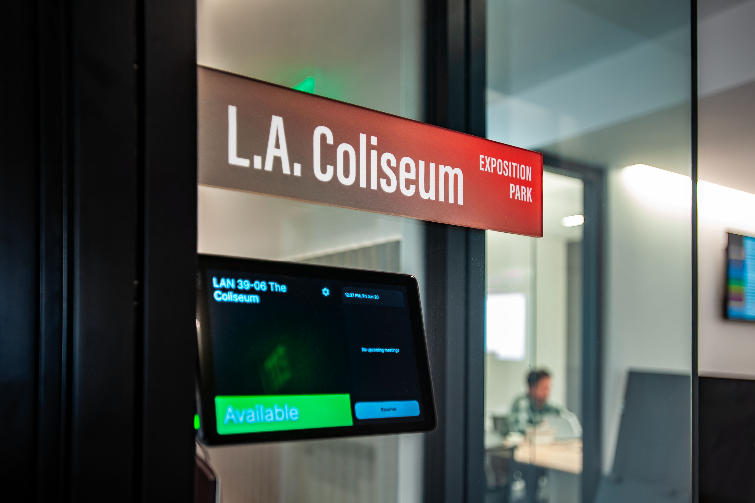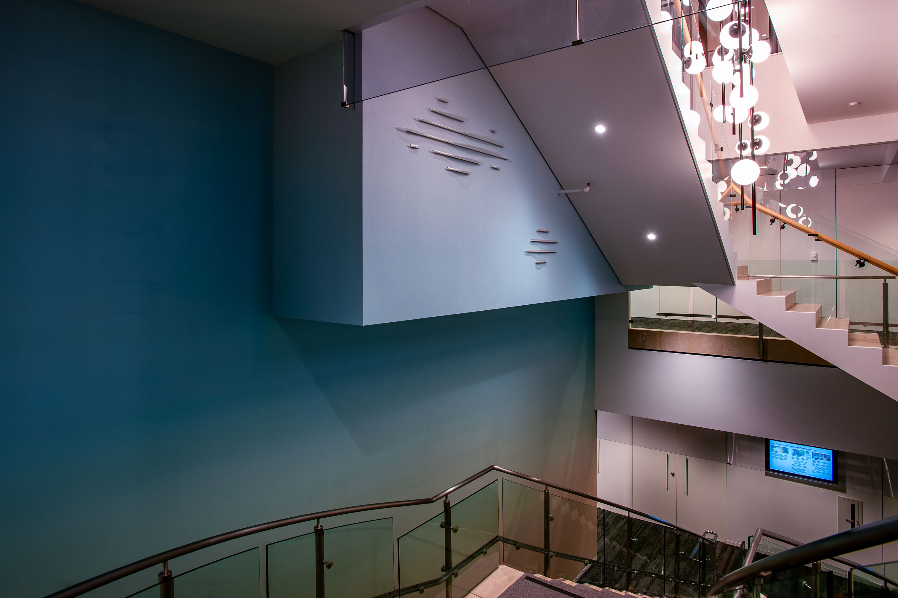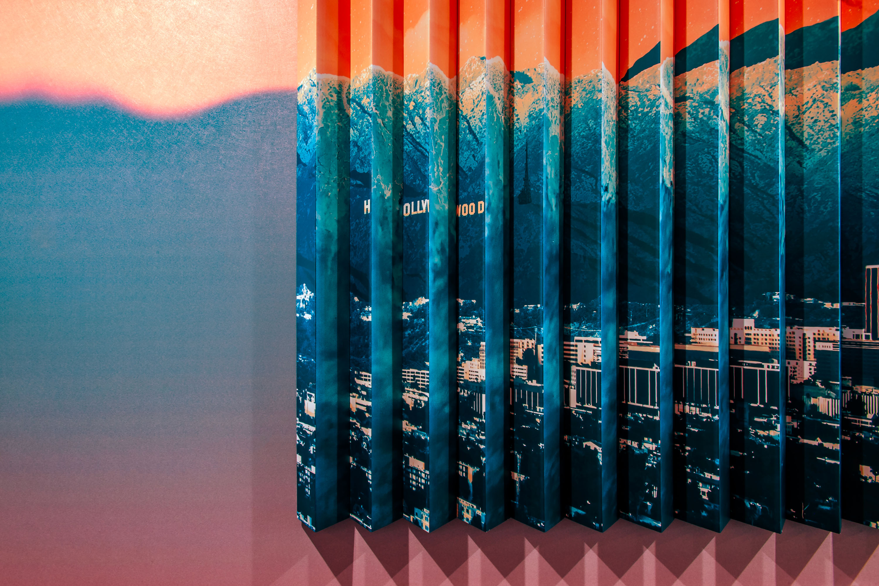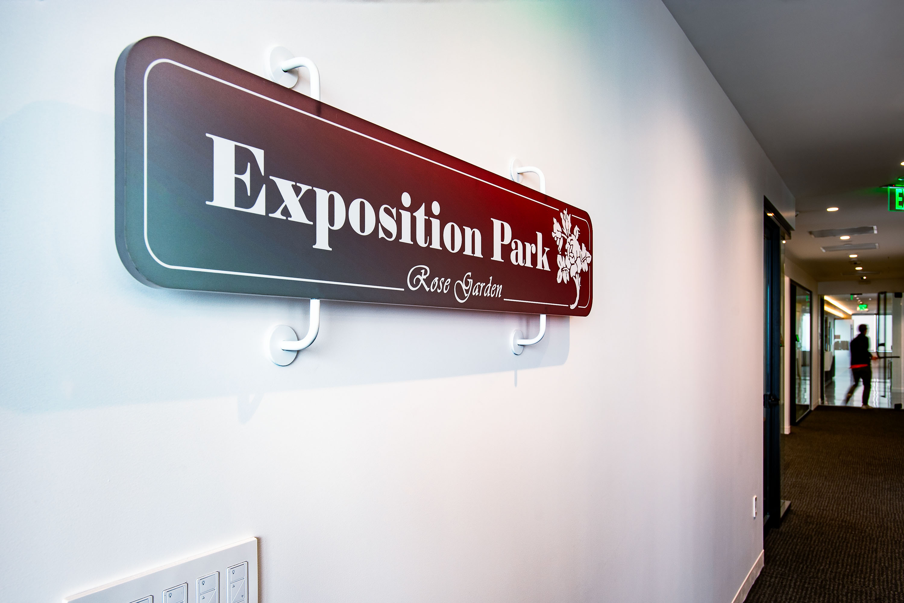 Asked to imbue a featureless hallway with virtually no natural light sources with the same chromatic brightness of other graphic elements in the office, we proposed a set of lenticulars set against a soft backing graphic. From a few different design proposals, the client favored one concept in which a bird's eye view of waves crashing on the shoreline was synchronized with a corridor-long panoramic photo of the San Gabriel Mountains behind Los Angeles' skyline.