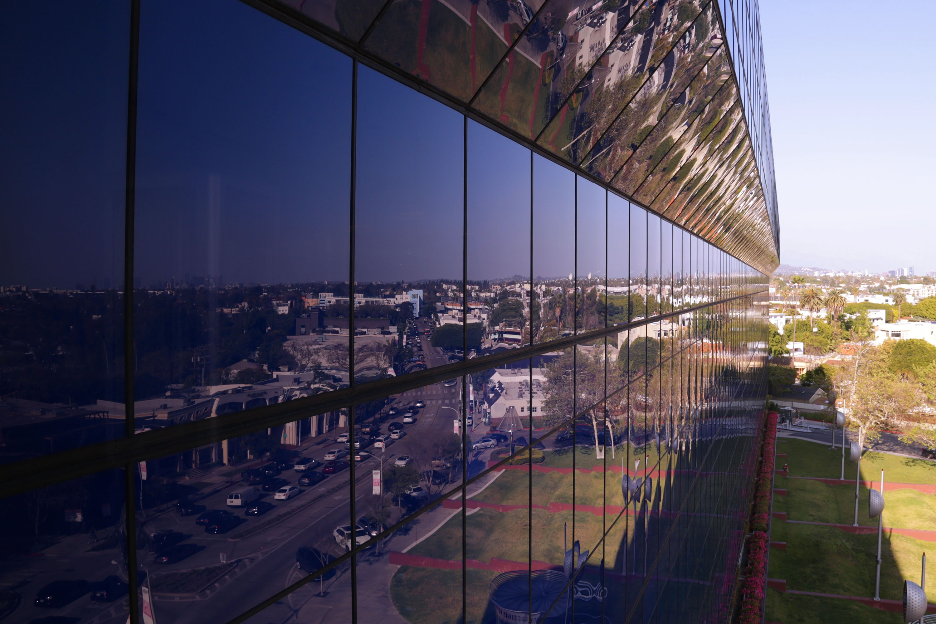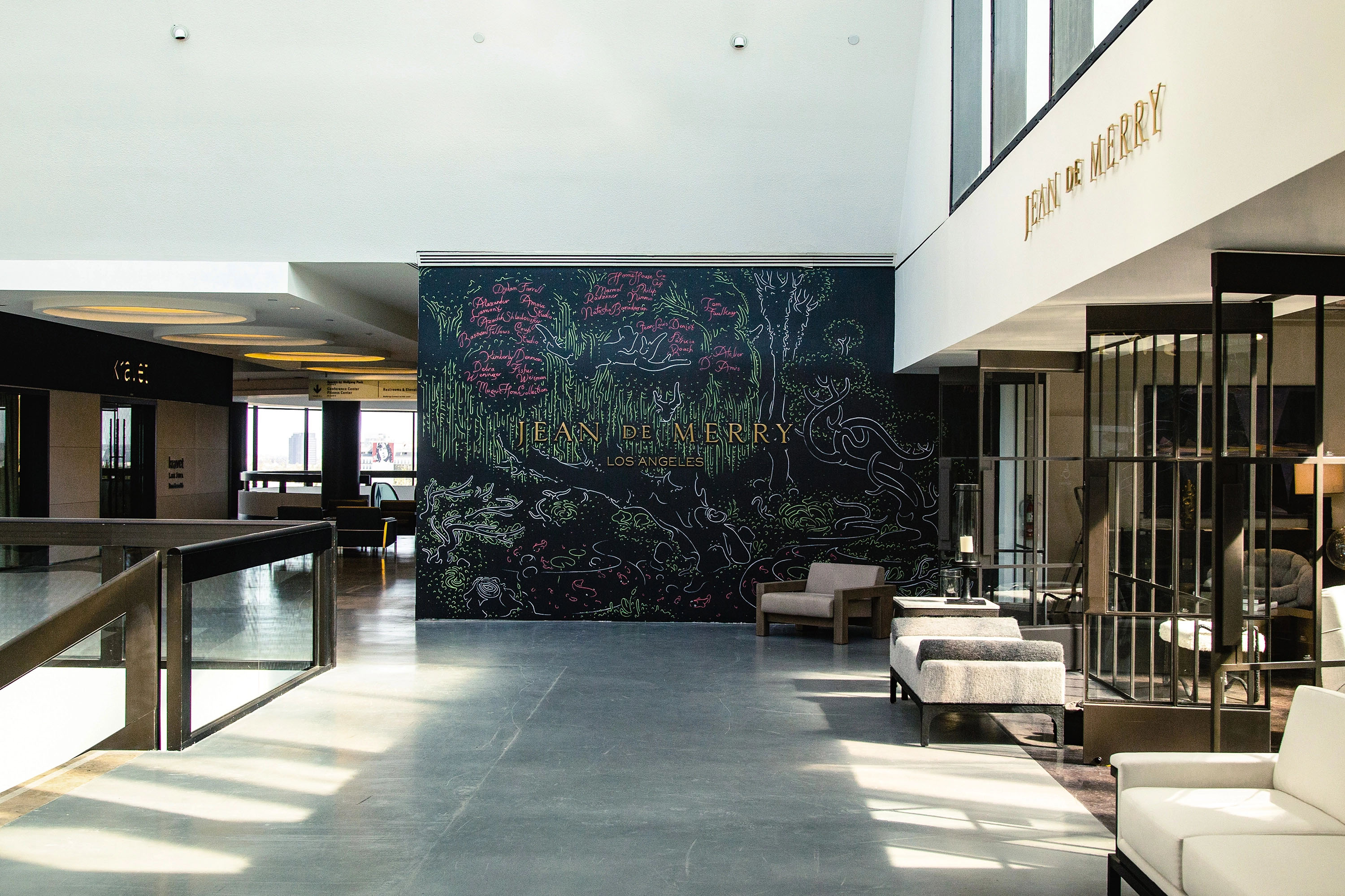 Distinguished custom furniture designer Jean de Merry's Los Angeles showroom, located at the historic West Hollywood commercial design complex, features a prominent charcoal-black surface embellished with a brushed steel logo.